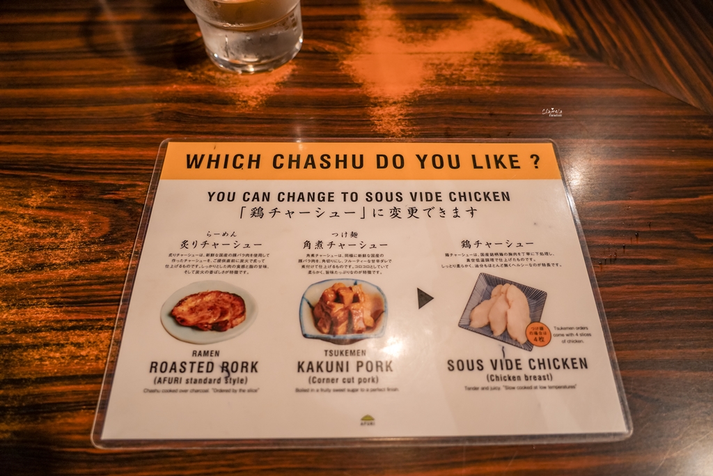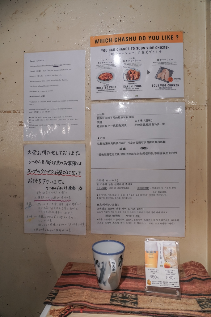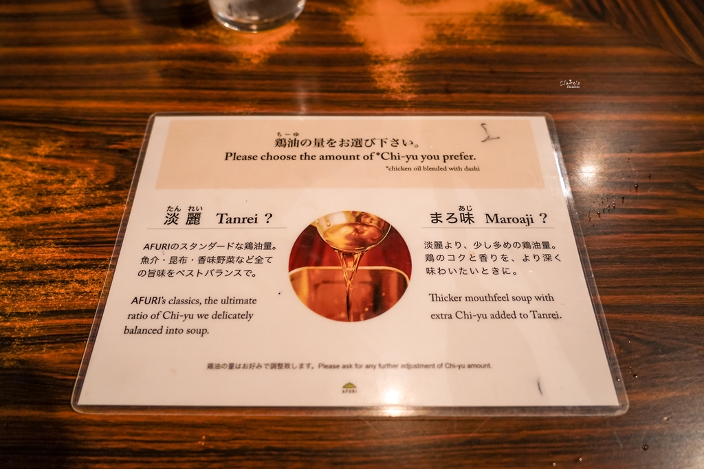 點餐完畢之後店員會來詢問湯頭,口味有濃、淡兩種,大概是太多觀光客來吃了,Afuri很貼心的準備了日文、中文、韓文、英文的說明,不知道要怎麼選的話就抬頭看看牆上的提示吧!