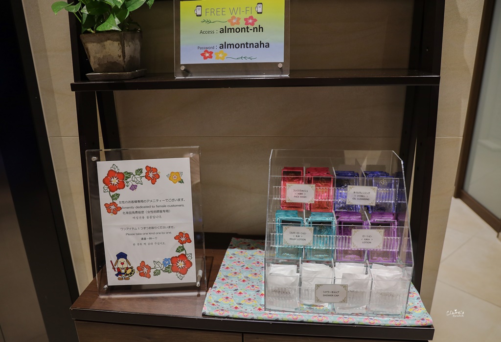 在沖繩到處都可以看到風獅爺,就連這裡也不例外。一樓大廳的櫃子擺放了女性專用的備品,有浴帽、化妝水、乳液等等,有需要的話都可以自取。