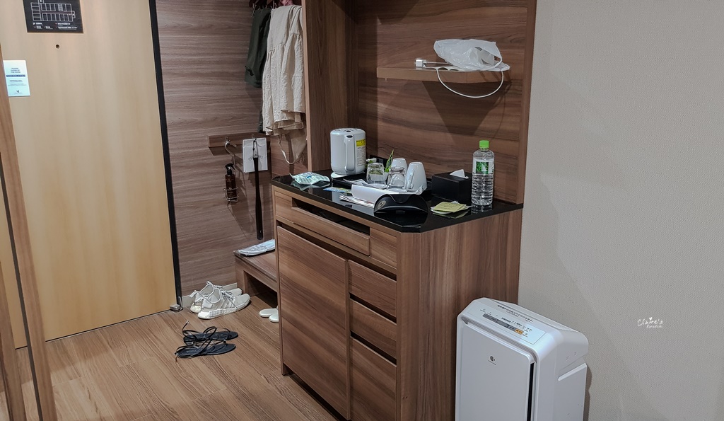 門口是穿鞋區與一個小小的開放式衣櫃,在日本的旅館,都可以發現他們很會充分利用每一吋空間,而旁邊的櫃子則有冰箱、熱水壺與杯子。
