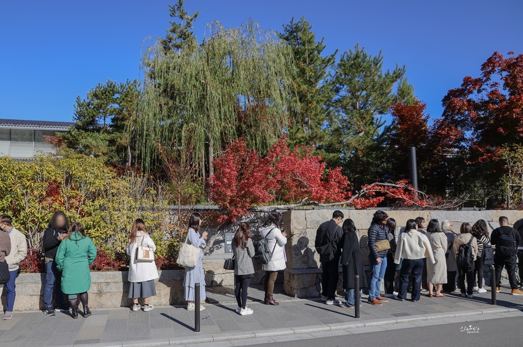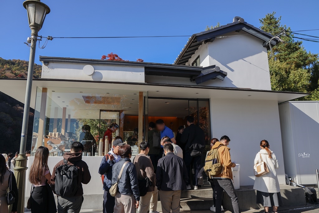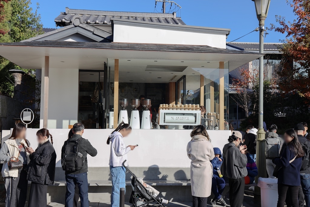 %Arabica咖啡嵐山店是早上九點開始營業,我們八點半經過的時候,已經有一些人在排隊了(請看第一張圖)⋯等到我們十點鐘結束祐齋亭的行程,排隊的人潮已經變得非常長,目測至少要等40分鐘到一小時。