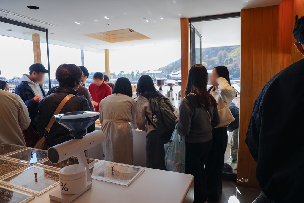 要是平常的我,是絕對不會花時間排隊的,但是第一次來嵐山,總覺得必須要在這麼漂亮的景色之下喝我的人生第一杯%Arabica咖啡,於是我們也默默加入排隊的行列。