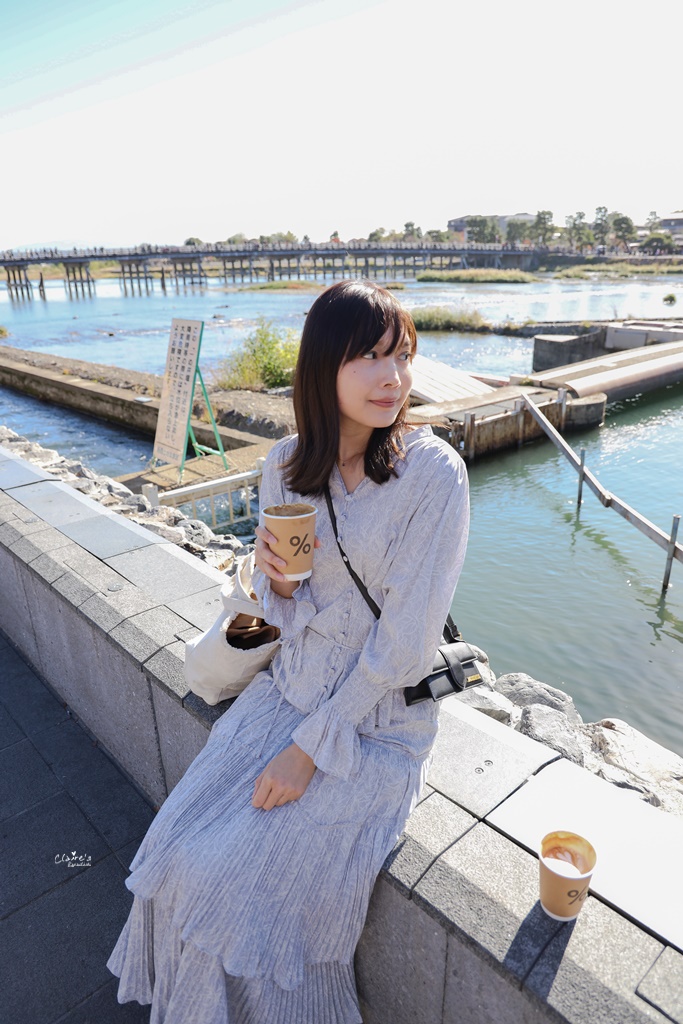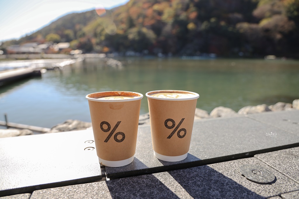 接著,就可以到渡月橋旁邊享用咖啡了! 京都拿鐵的味道比咖啡拿鐵更甜一些,不過,除了甜味的部分之外,我喝不太出來這兩杯有什麼太大的差異,總之兩杯都很順口,奶味、苦味與酸味都很平衡,是好喝的拿鐵。