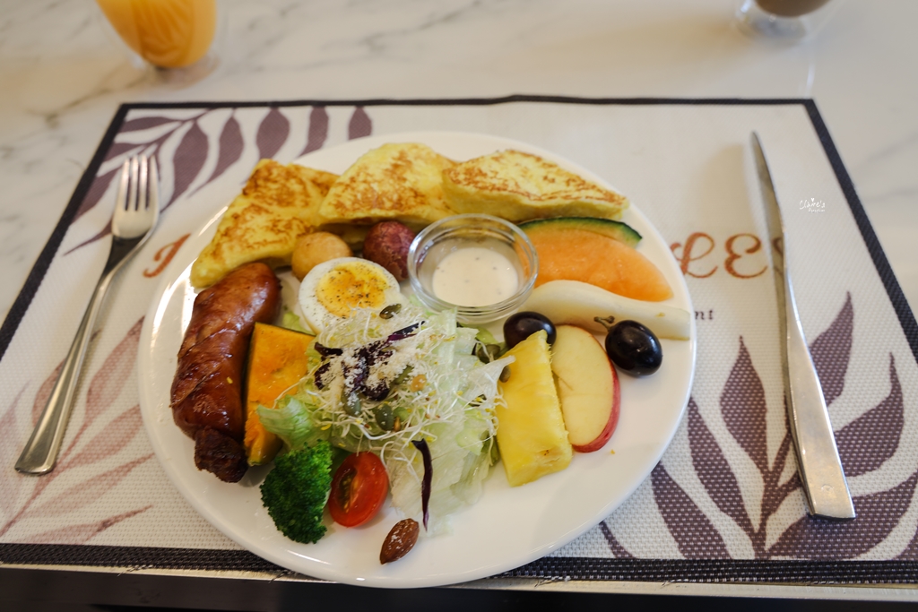 早餐是現做的,所以入座後需要稍微等待一下,餐點內容很豐盛,有帶骨香腸、沙拉、法式吐司、水果…等,不但好吃,份量也足夠。