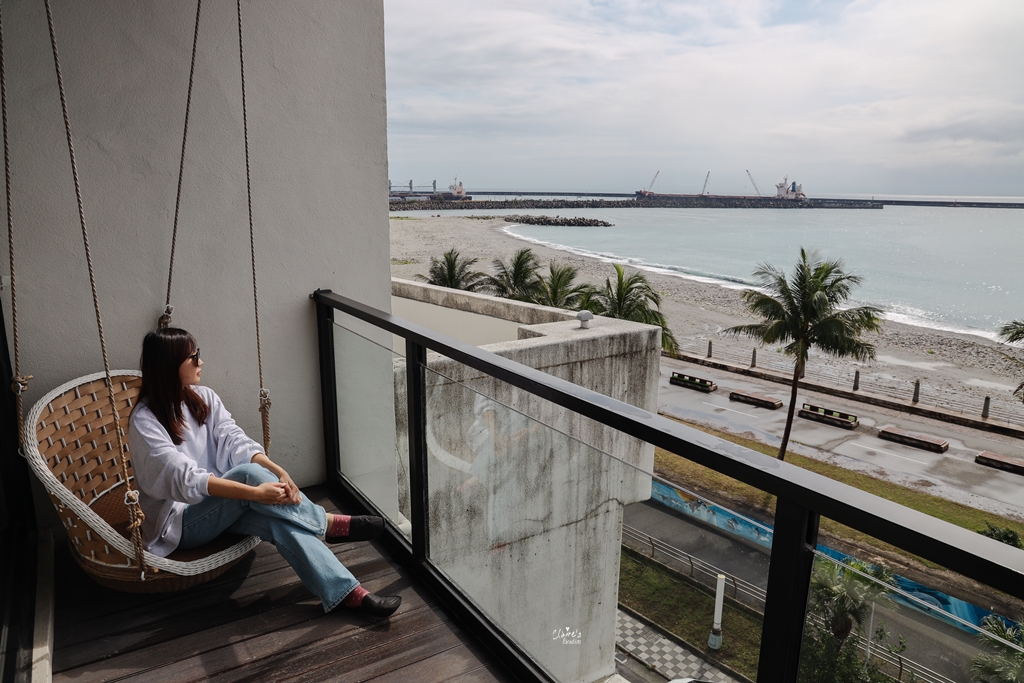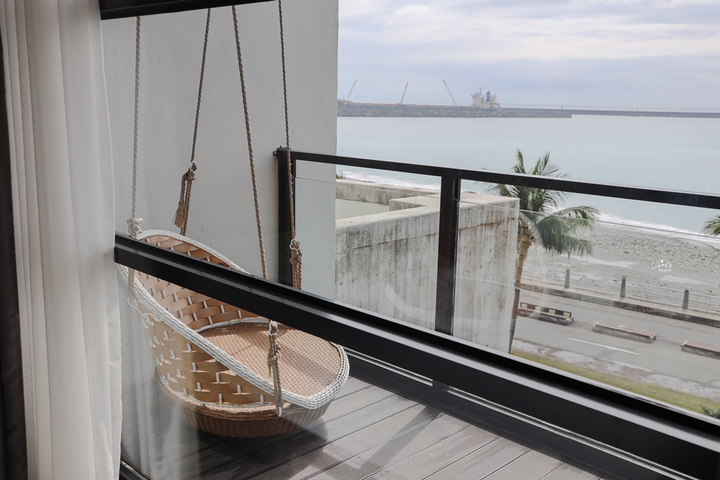 前面有提到,5樓海景房的特色就是陽台的鞦韆,沒有下雨的時候,請務必踏出房門,來陽台吹吹風、看看海,不然就太浪費了~~~下圖是鞦韆的使用示範,拍照的時候沒注意到我穿襪子又穿了室內拖,請大家忽略這個奇怪的搭配哈哈哈。