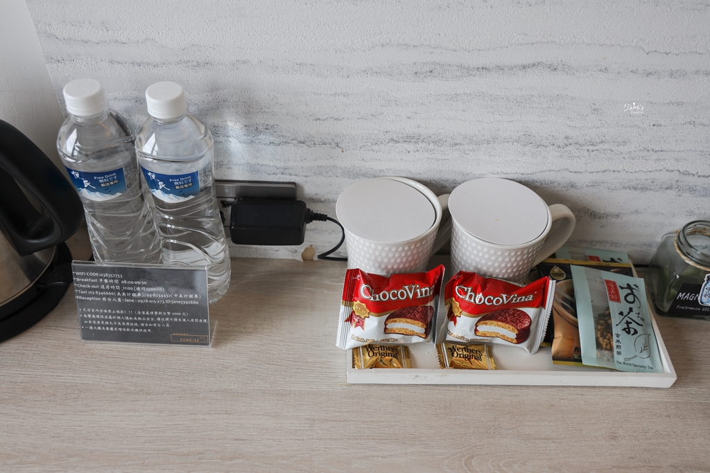 房內附有兩瓶礦泉水,以及餅乾與茶包,吃不夠的話可以再到一樓大廳拿取。