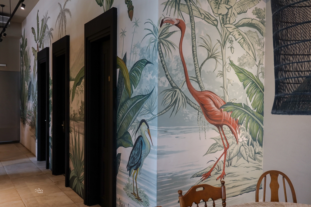這幅彩色壁畫應該是整間店顏色最豐富的區域了,一看到我最愛的鳥類,馬上就被吸引過去了,而這幾扇神秘的門後面藏著的其實是洗手間。