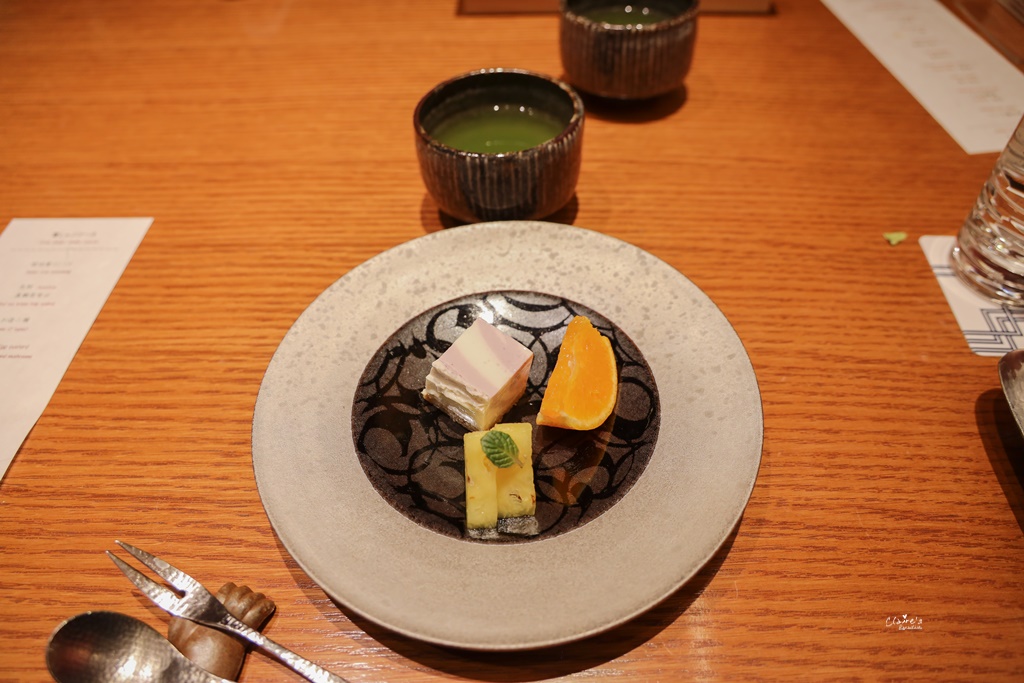 最後還有甜點與熱抹茶做為收尾,上圖是一般的甜點,有蛋糕與兩種水果,下圖是慶生版本的,因為我在訂位的時候,有註明這趟是要來慶生的,因此就獲得了這個特別版的甜點了。