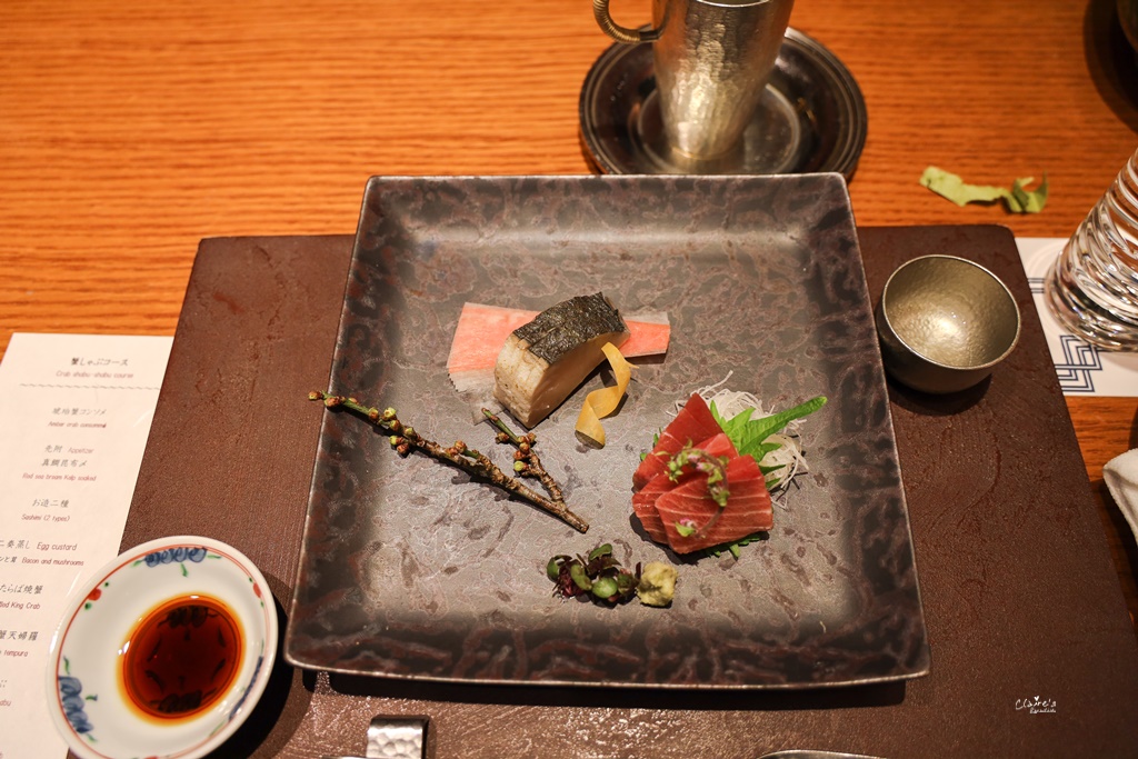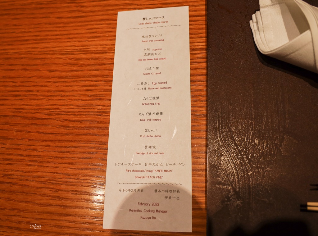 店內的氣氛很好,窗邊的座位還能俯瞰銀座的街景,我覺得很適合來這裡約會或是慶祝特殊節日。銀座蟹みつ的餐點以各式活毛蟹套餐為主,一份套餐的價位大約在20,000日圓~44,000日圓之間,而我們點的則是螃蟹火鍋套餐(蟹しゃぶコース),總共有八道料理,價格是18,480日圓。詳細菜單請點這裡。