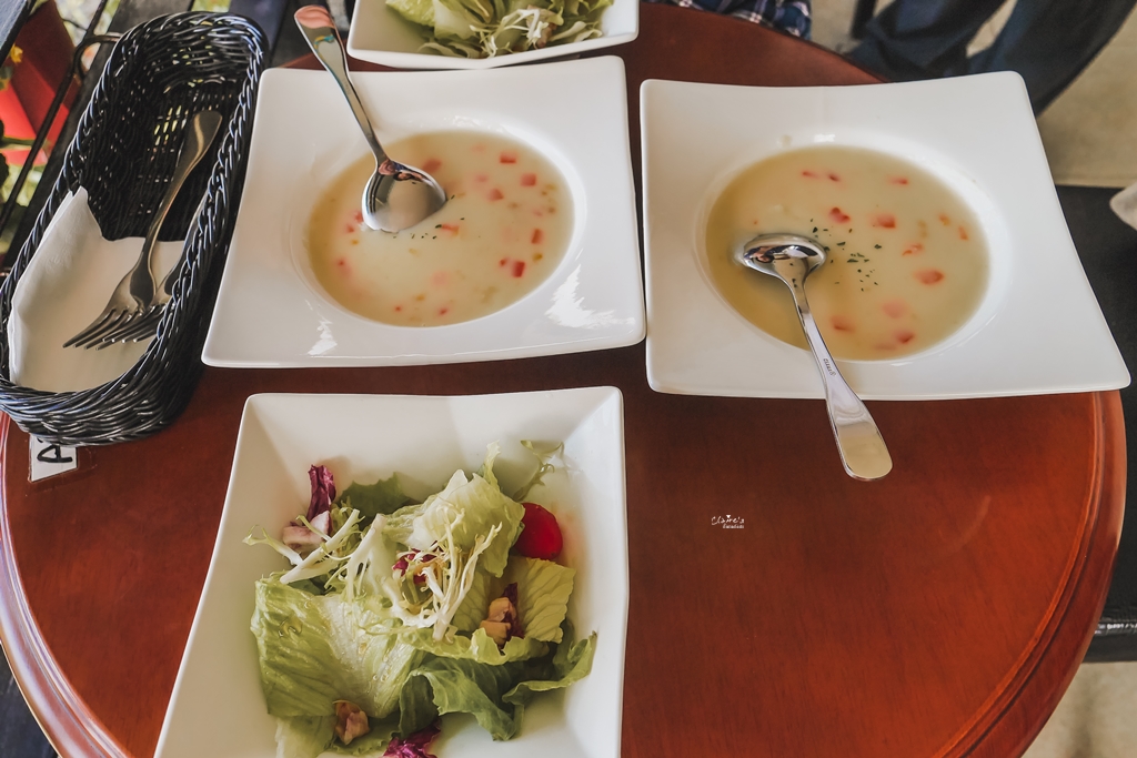 拍照拍得差不多了之後,餐點也準備好了。青立方的主餐以義大利麵、燉飯為主,平均單價約在350~400元之間,加價150元就可以享有套餐:沙拉、湯與蛋糕。以景觀餐廳來說,這個價位並不算太貴,而且很棒的一點是這裡不收服務費,低消也只要120元,如果不餓的話,點杯飲料或輕食就可以了,老闆這樣子做生意真的會賺錢嗎…?