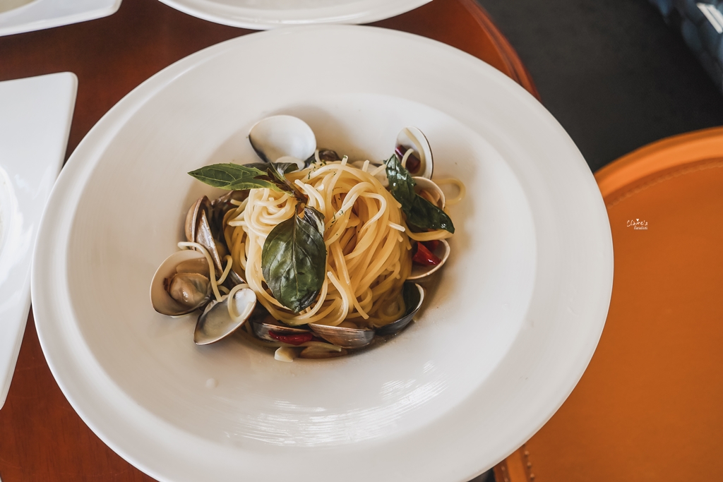濃湯跟沙拉都算中規中矩,是很大眾的口味,我們的主餐分別點了白酒蛤蠣義大利麵與巴沙米可時蔬義大利麵,我的白酒蛤蠣麵有點太乾,要不然其實味道還不錯,媽媽說她點的時蔬義大利麵也很好吃,餐點的份量以女生來說是會飽的。