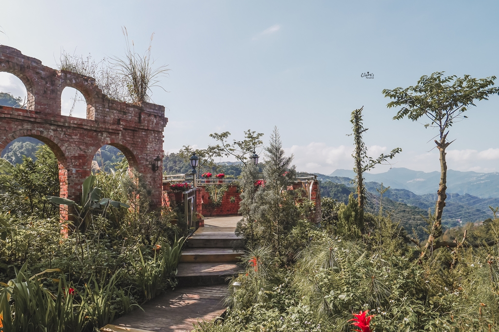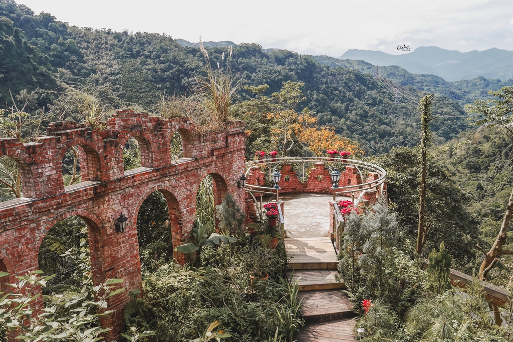 這個半圓形的觀景台是兵家必爭之地,人多的時候要拍照還要排隊…我覺得這裡的最佳拍攝點就是在我們坐的位子,可以將青立方的特色─觀景台、紅磚牆與四周的綠色山巒一次盡收眼底,以下這個畫面是不是很有天空之城的感覺~超級夢幻!