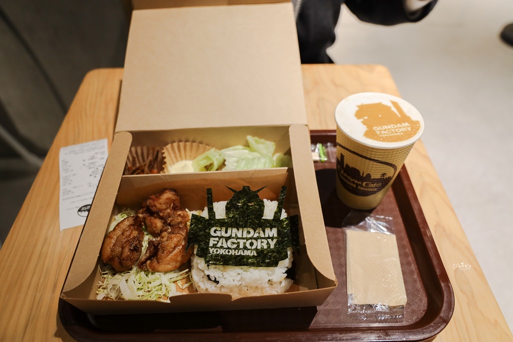 我們點的是炸雞便當跟有著鋼彈圖案的熱拿鐵,便當出乎意料的好吃!
