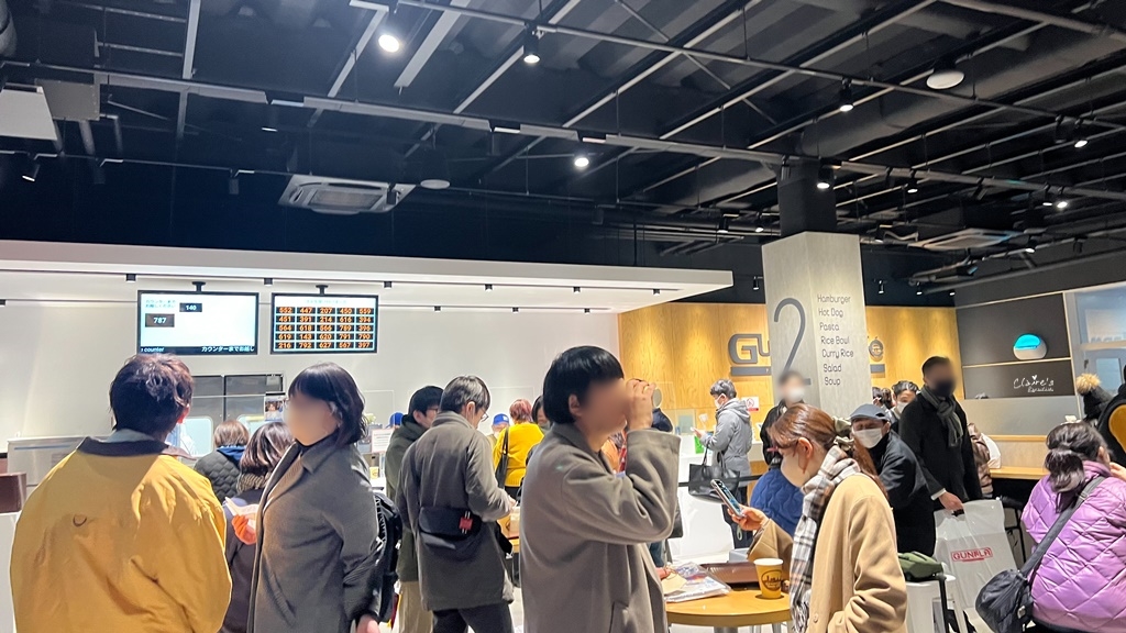 點餐方式是使用一旁的自助點餐機,點好餐、付款完成,就會取得號碼牌,接著等叫號就可以了。我們好不容易在人山人海的室內找到一個空位,冬天的橫濱夜晚實在是太冷了,完全沒辦法在室外待太久。