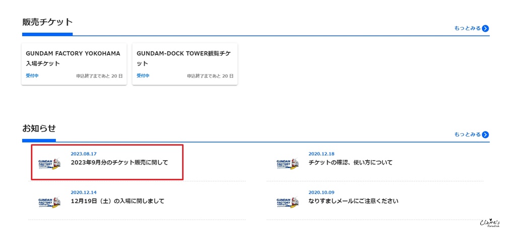 網路購票的開放時間,大約是前一個月的月中,會開放購買次月的門票,如果想知道確切的時間,在進入購票頁面之前,先把頁面往下拉,在お知らせ下方,有一項”2023年9月分のチケット販売に関して”,點進去就會看到這個月份的門票販售時間。