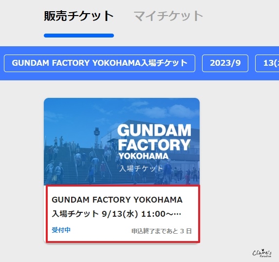 登入後就可以開始買票了! 要買入場券的話,點選左邊的GUNDAM FACTORY YOKOHAMA入場チケット。