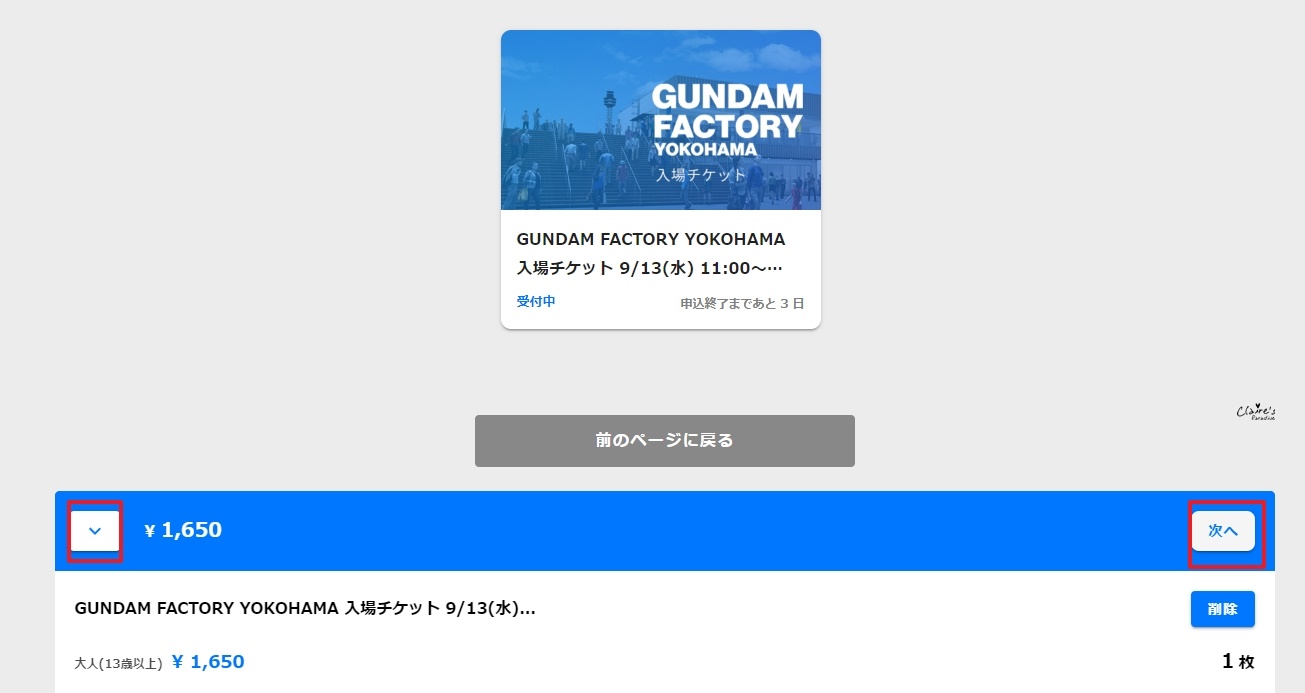 選擇人數,完成之後按下方的”カ─トに入れる”,加入購物車。Gundam-dock tower的門票不分大人小孩,都是3,300日圓/人。