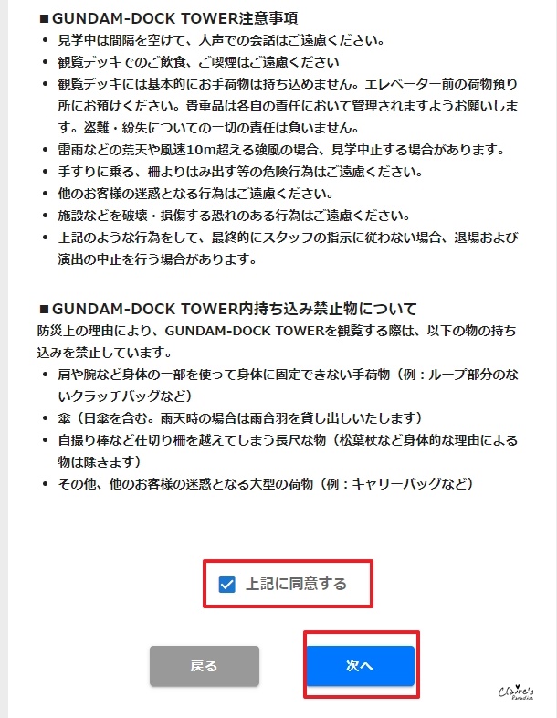 接著會列出一些參觀的注意事項,把頁面拉到最下方,打勾、點選”次へ”。