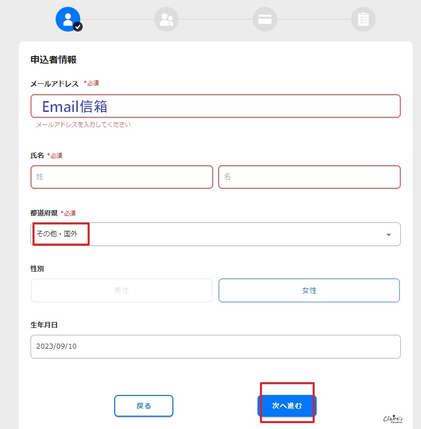 填入Email信箱、姓名、地區選擇國外、性別、生日,接著按””次へ”,使用刷卡的方式付款,就完成購票流程了。