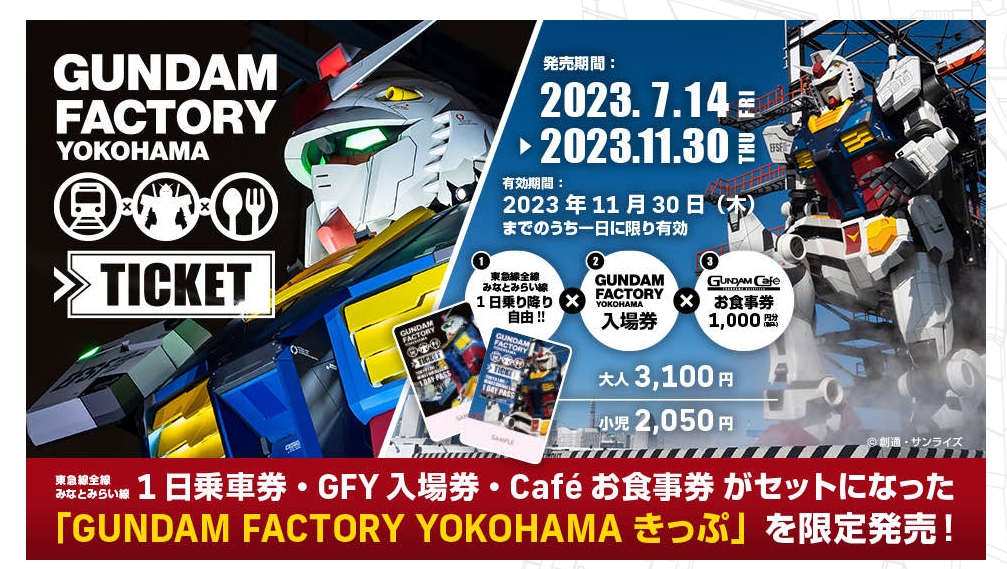 購買套票的話,會拿到三張票券,包含東急線全線與橫濱的港未來線(みなとみらい線)一日乘車券、橫濱鋼彈工廠入場券、Gundam cafe 1,000日圓的餐券,套票金額為大人3,100日圓,兒童2,050日圓。