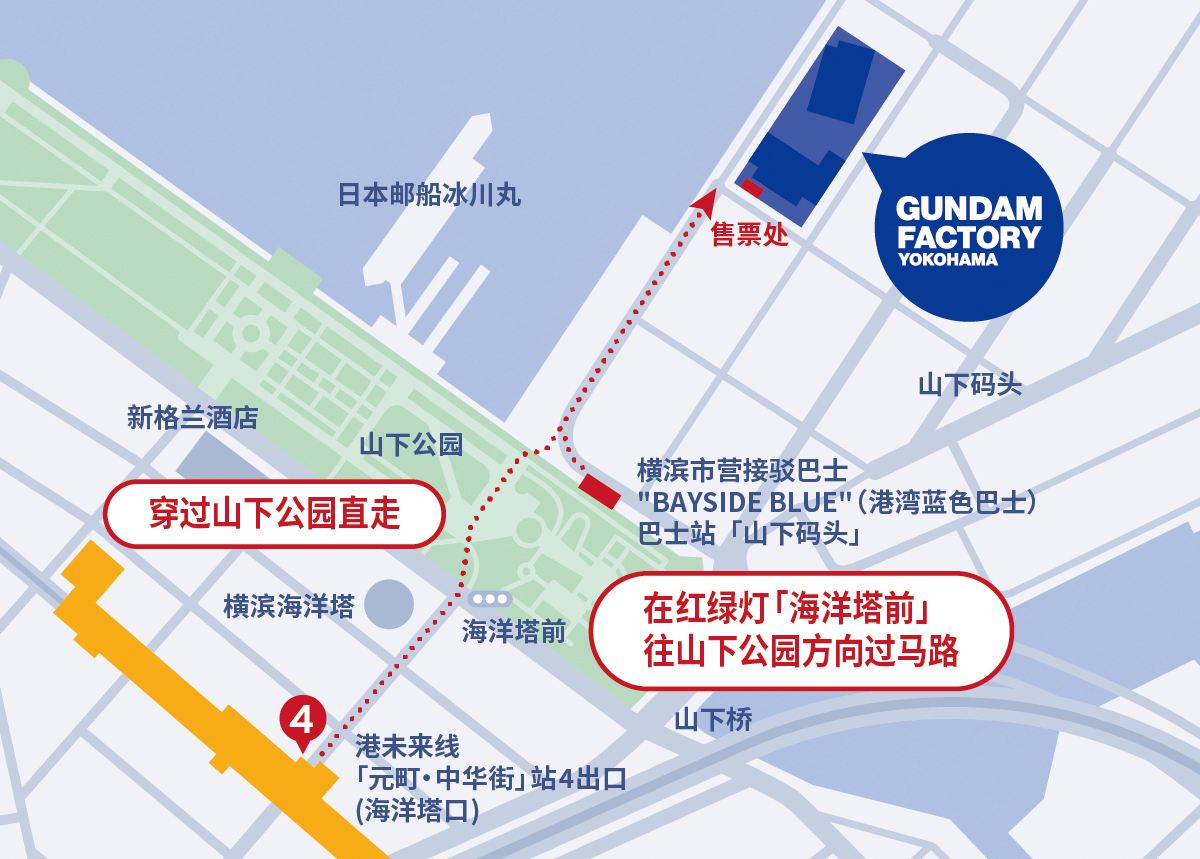 橫濱鋼彈工廠的交通很方便,從東京到橫濱的車程大約半小時以內,接著,再從橫濱站搭乘港未來線(みなとみらい線)到元町‧中華街站,4號出口出站後,步行7分鐘即可抵達售票處。(地圖如下圖,官網只有簡體中文的版本,大家就加減看一下…)