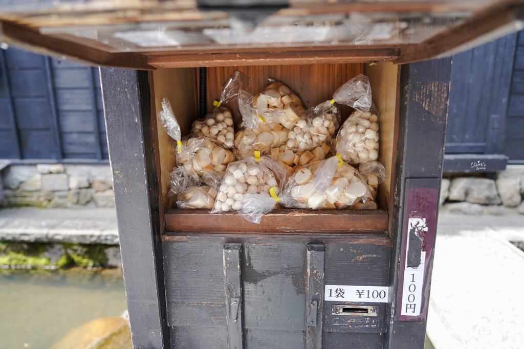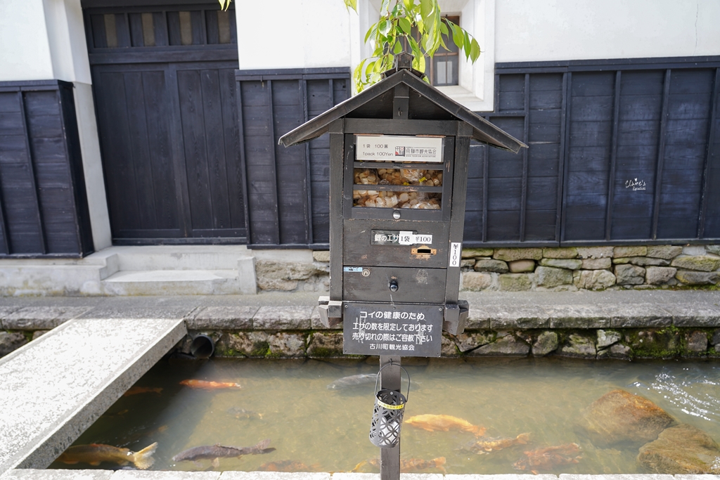瀨戶川裡的鯉魚數量多達1000隻以上,看到這些肥肥的鯉魚們,想必牠們平常的伙食應該是挺不錯的(笑)。要如何購買魚飼料呢? 在瀨戶川旁邊,就會看到飼料販賣機了,說是販賣機好像也不對,因為它並不是一台自動的機器,遊客把100元日幣投入後,再自己把上方的門打開、取走一包飼料即可,也就是不投錢其實也可以拿飼料…一切都取決於遊客的良心。