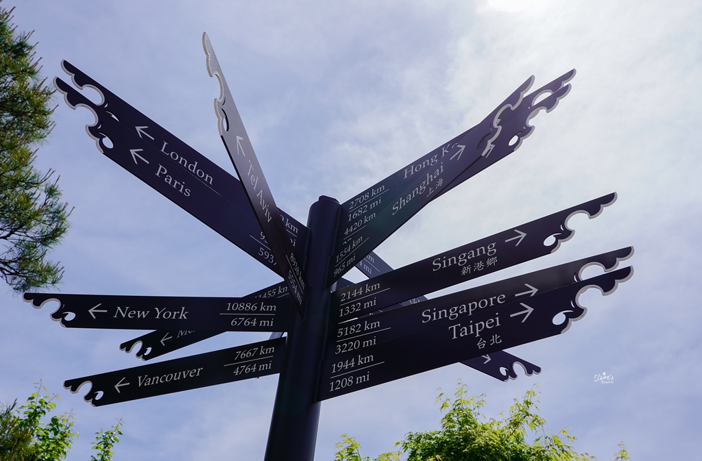 走著走著,又發現了指示牌,只不過上面所寫的地名,並不是這裡的景點,而是換成了各個國際城市,其中也有台北,原來,台北與飛驒的距離是1944公里呢!