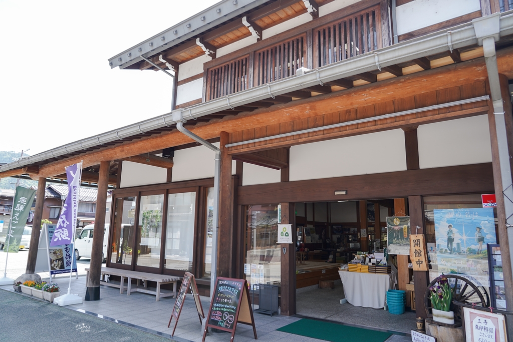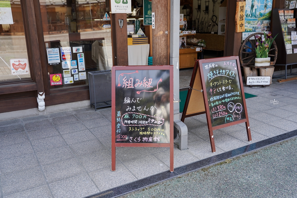 當我們經過這間飛驒古川櫻花物產館,被門外那張「你的名字」海報所吸引而停了下來,店裡除了販售當地的特色文物,還有提供組扭教學,也就是電影裡女主角三葉所配戴的結繩髮帶。