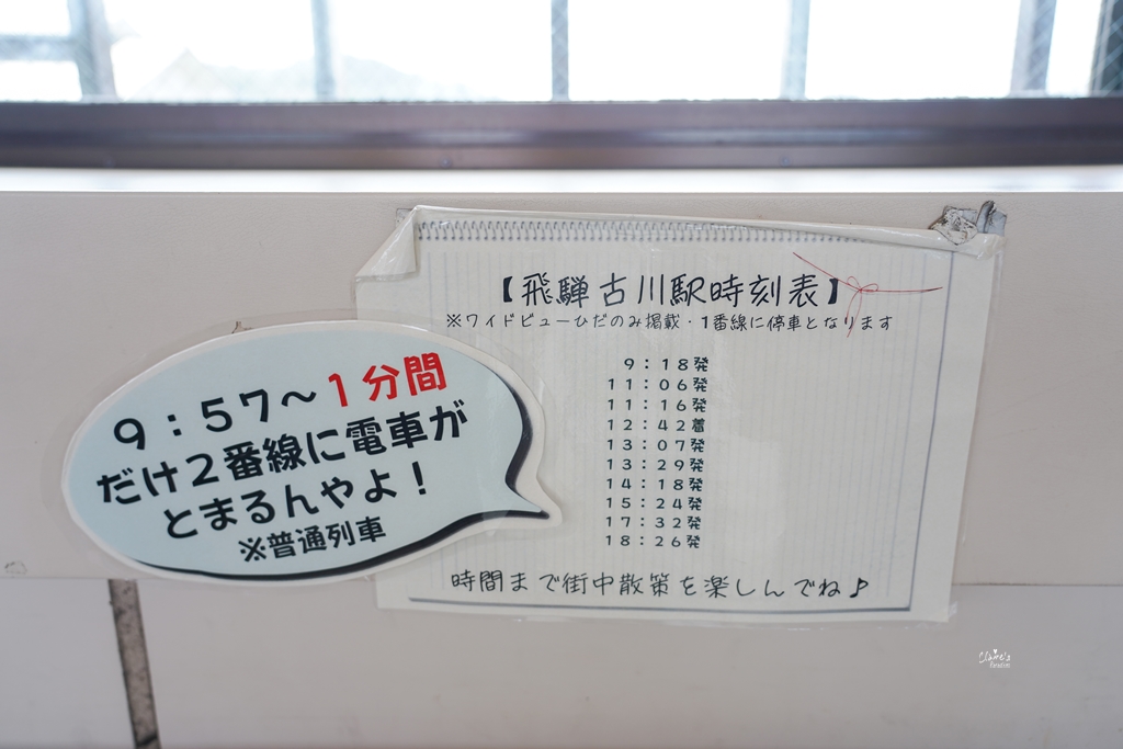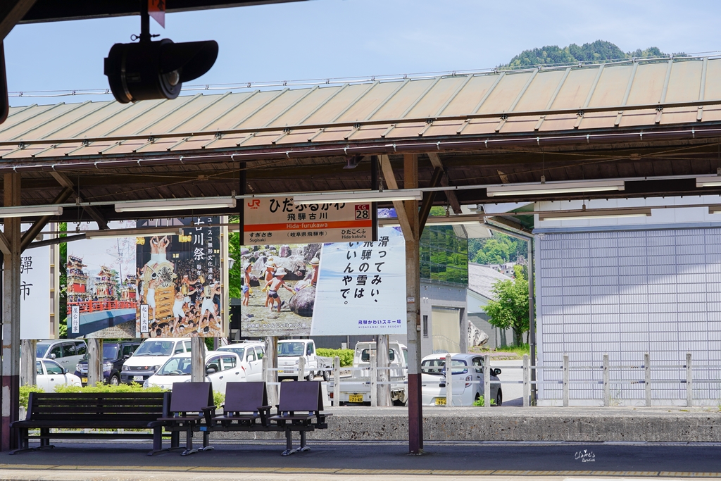 我們從高山站出發,搭乘JR高山本線到飛驒古川站,車程僅16分鐘而已,非常快速! 但是車次很少,錯過一班的話就要再等一個小時…如果趕不上JR,也可以考慮在高山車站搭濃飛巴士,車程大約37分鐘。