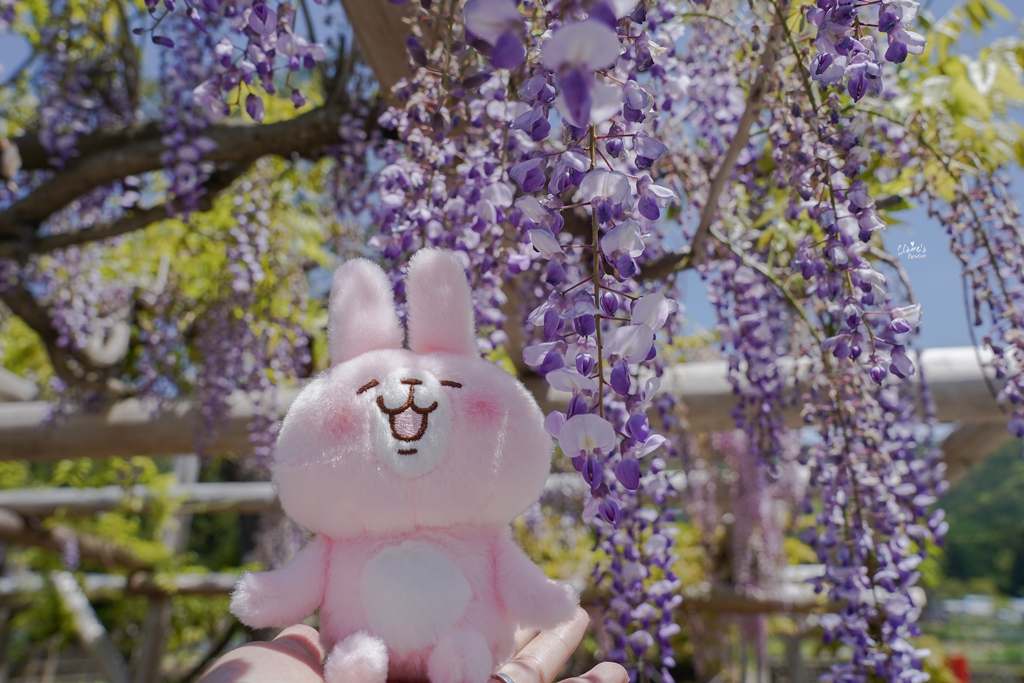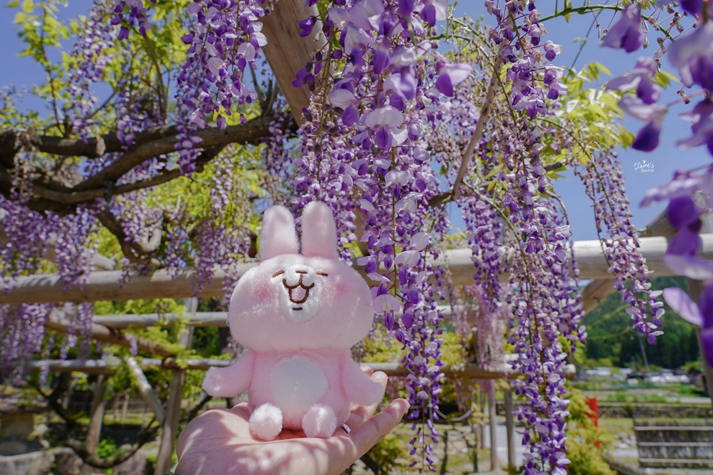 一整片垂墜下來的紫藤花,真的跟想像中的一樣夢幻,隱約還聞得到淡淡的香氣。我此刻的表情,就跟這隻兔兔一樣開心的一直傻笑。短暫的飛驒古川半日遊,就以紫藤花作為最完美的結尾。