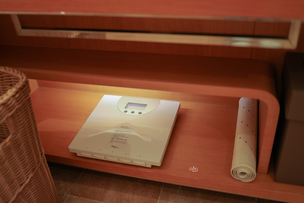 該有的備品都很齊全,吹風機的品牌是Panasonic,洗手台底下還放了一台體重計,不敢面對現實的我們,從頭到尾都沒有碰過它。