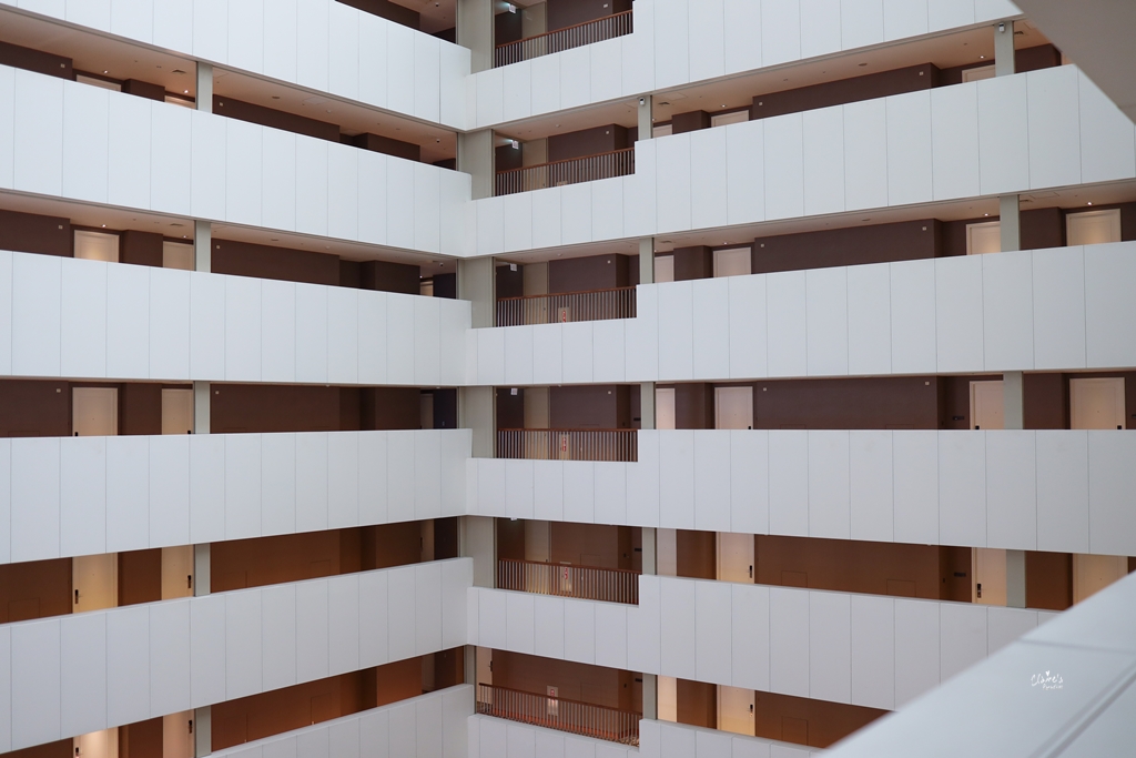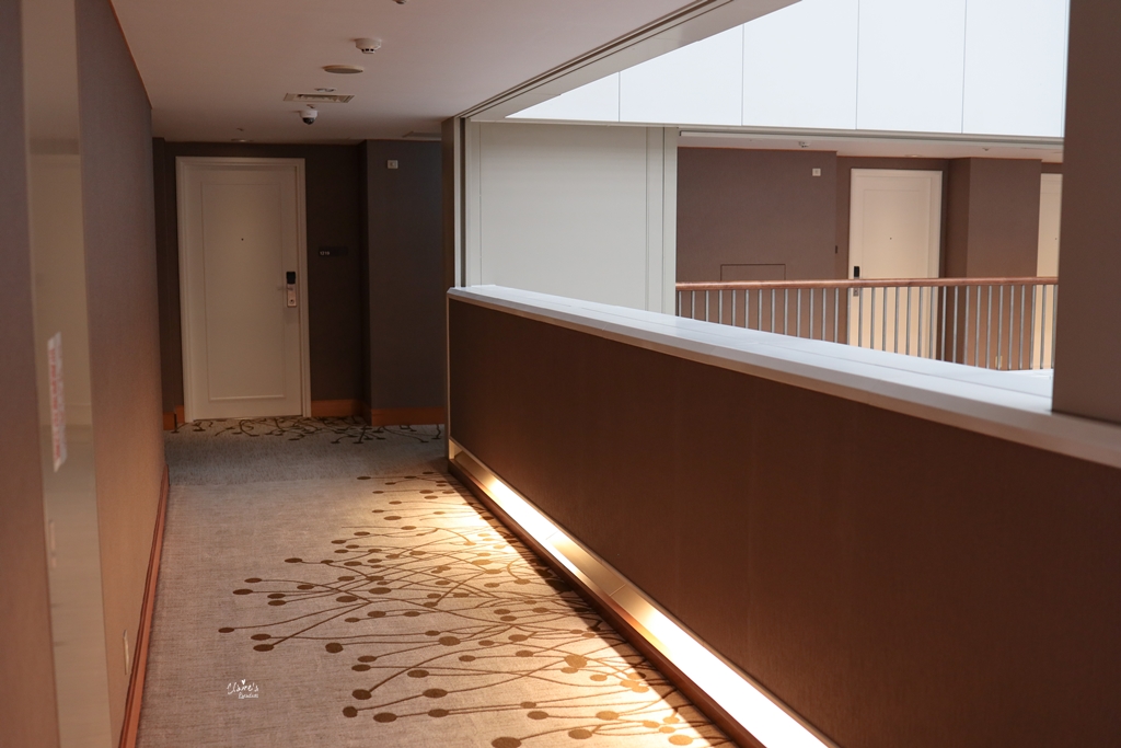 這是客房樓層的梯廳與走廊,之前曾看過網友表示,房間的內裝與六福皇宮差異不大,感受不到日系飯店的風格(從那篇報導的照片看起來是真的滿像的…),但因為我以前沒住過六福皇宮,不太確定公共空間的部分是否也是沿用舊有的裝潢,但是就我個人的感受來說,米白色搭配咖啡色系,這種簡約典雅的風格還挺日系的呀!
