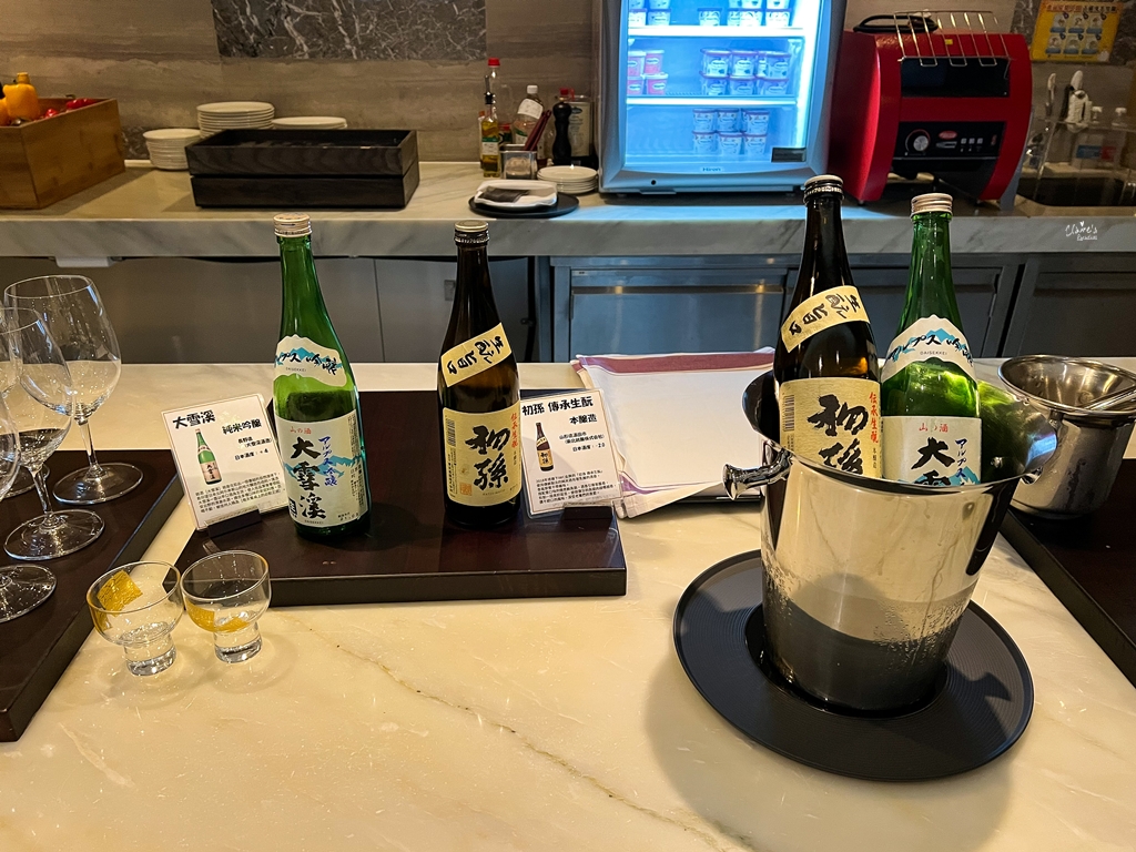 JR東日本大飯店台北和其他飯店的Happy hour最大的不同,就是這裡供應的酒類包含了特色清酒,我們喝到的是「初孫」與「大雪溪」,分別產自山形縣與長野縣。