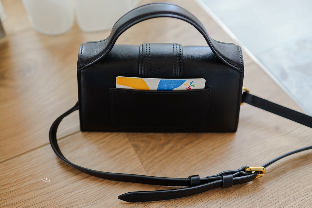 包包非常有質感,左下角有著Jacquemus的金色logo,如果是小尺寸的款式,左下角的字會是單一個”J”。它的皮革不太會產生刮痕,背出去好幾次,表面依然光滑亮麗。