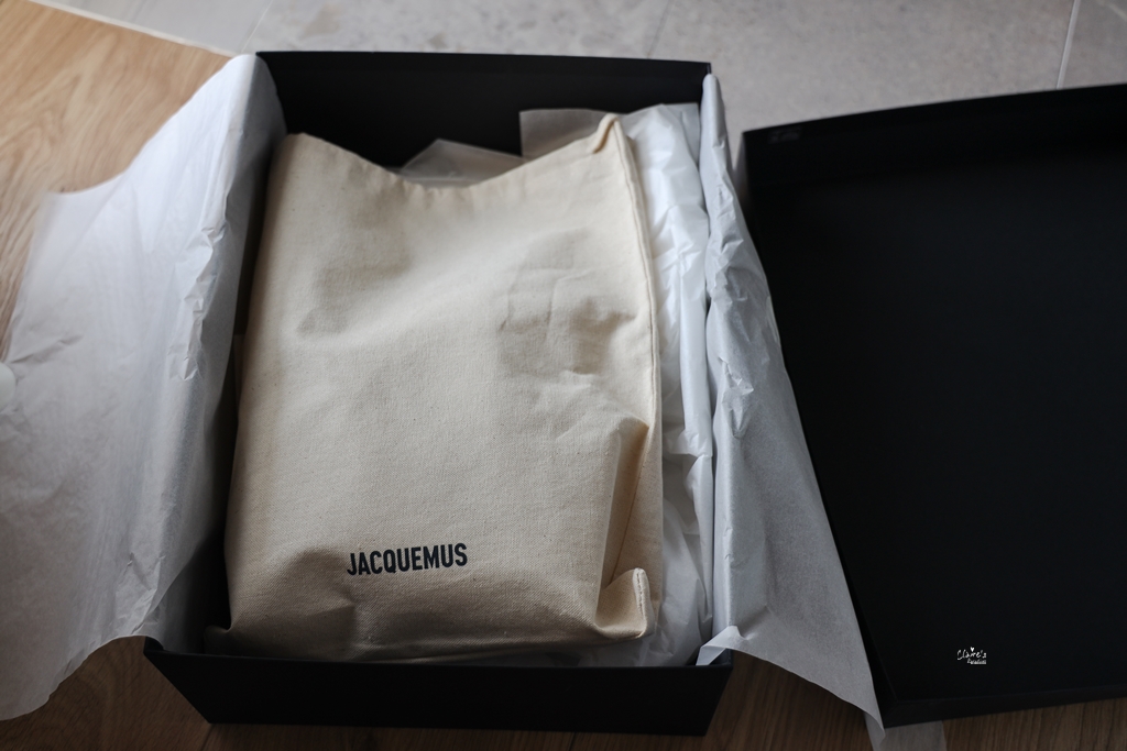 打開之後,裝在防塵袋裡的,就是我苦苦期盼已久的Jacquemus Le Bambino Bag了! 包包本體與側背的背帶都分別被妥善的包裝好,而且我覺得Jacquemus的防塵袋還滿厚實的,很不錯。