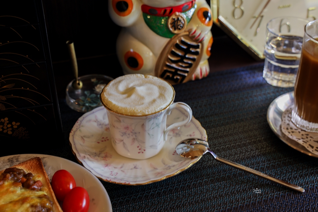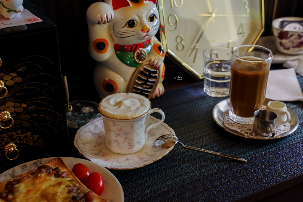 這個位子是不是真的很好拍~~~利用旁邊的書本與桌燈、招財貓等擺飾,把食物或飲料隨便一擺,畫面就顯得很豐富了,而且利用自然光加上桌燈的光線就足夠了,照片的色調會有一種自帶濾鏡的感覺,不需要再多加調色。