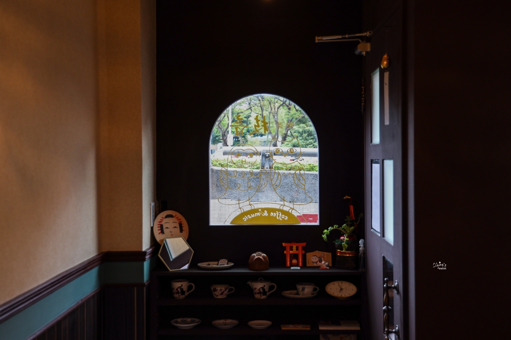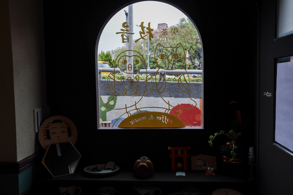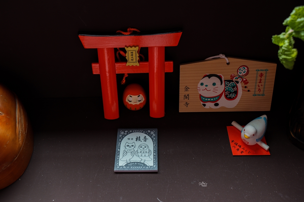 好喜歡喫茶枝音的logo,我還特地選了入口旁的位置,這樣一轉頭就可以看到門上的圖案了。一推開門就可以看到這一整櫃的可愛小物,看起來都是店家從日本帶回來的紀念品,常跑日本的話,應該會在這裡發現一些熟面孔。