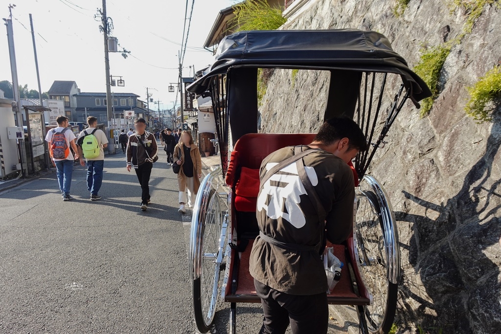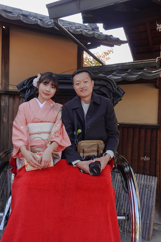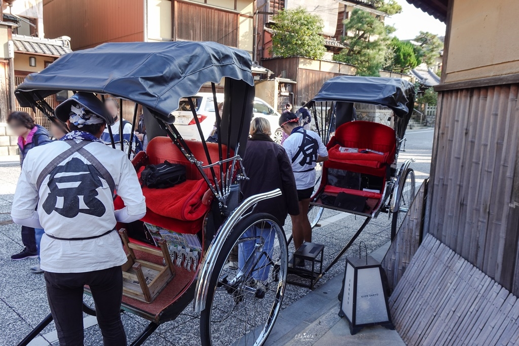 和服店位於八坂神社附近,走到清水寺大約要15分鐘,正當我們在掙扎要走路還是搭公車時,突然看到路邊在招攬客人的人力車,來日本這麼多次從沒搭過人力車的我們,覺得也是時候該體驗一次人力車了(其實只是懶得走路…)。