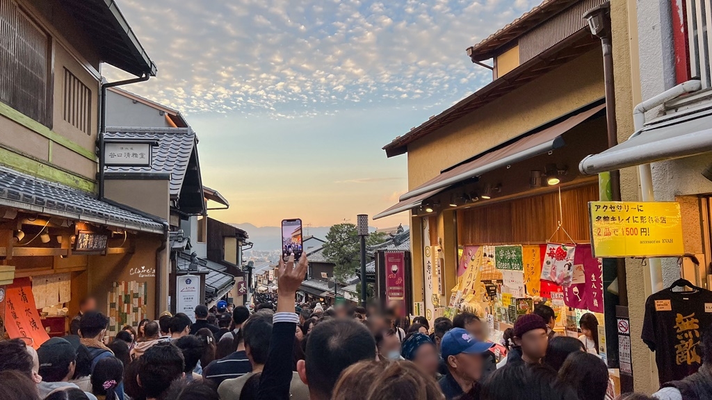 眼前的街道比清水寺裡的人潮更誇張,擠的動彈不得,我們幾乎是被人群推著走的,旁邊的店家也全部都是人,想要好好的逛街吃東西根本不可能。聽說這裡在早上八點過後,人潮就會逐漸湧現,想拍到空無一人的景象,大概只有早上六、七點的時候才有機會了。