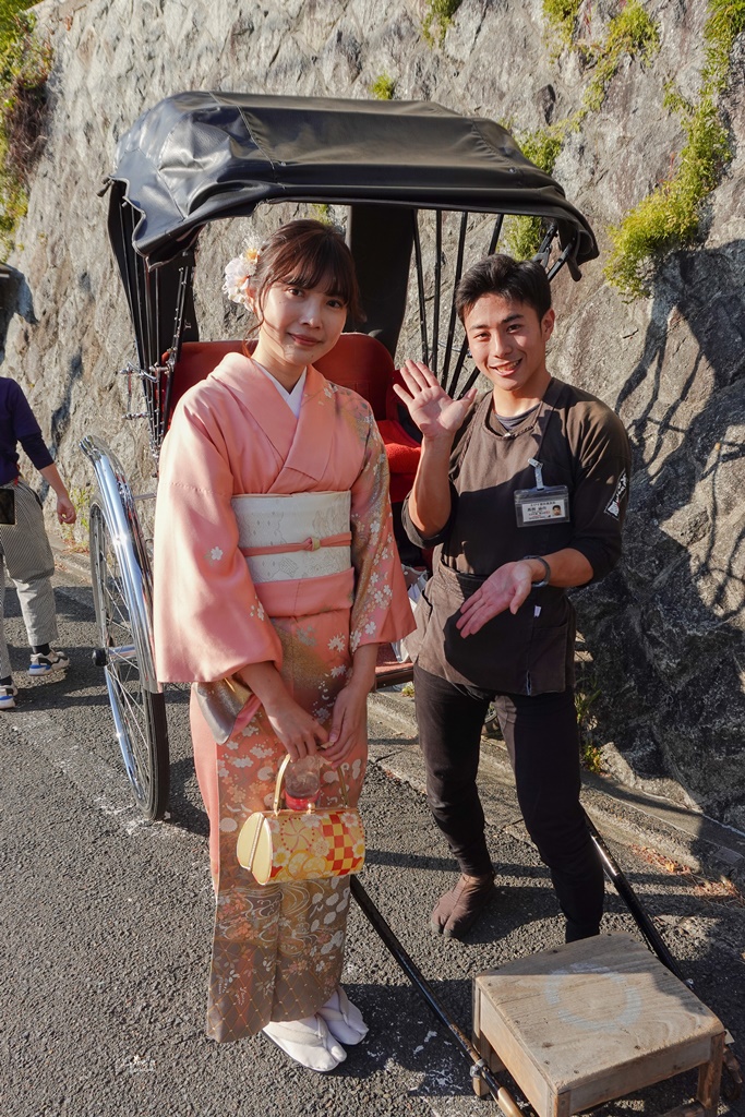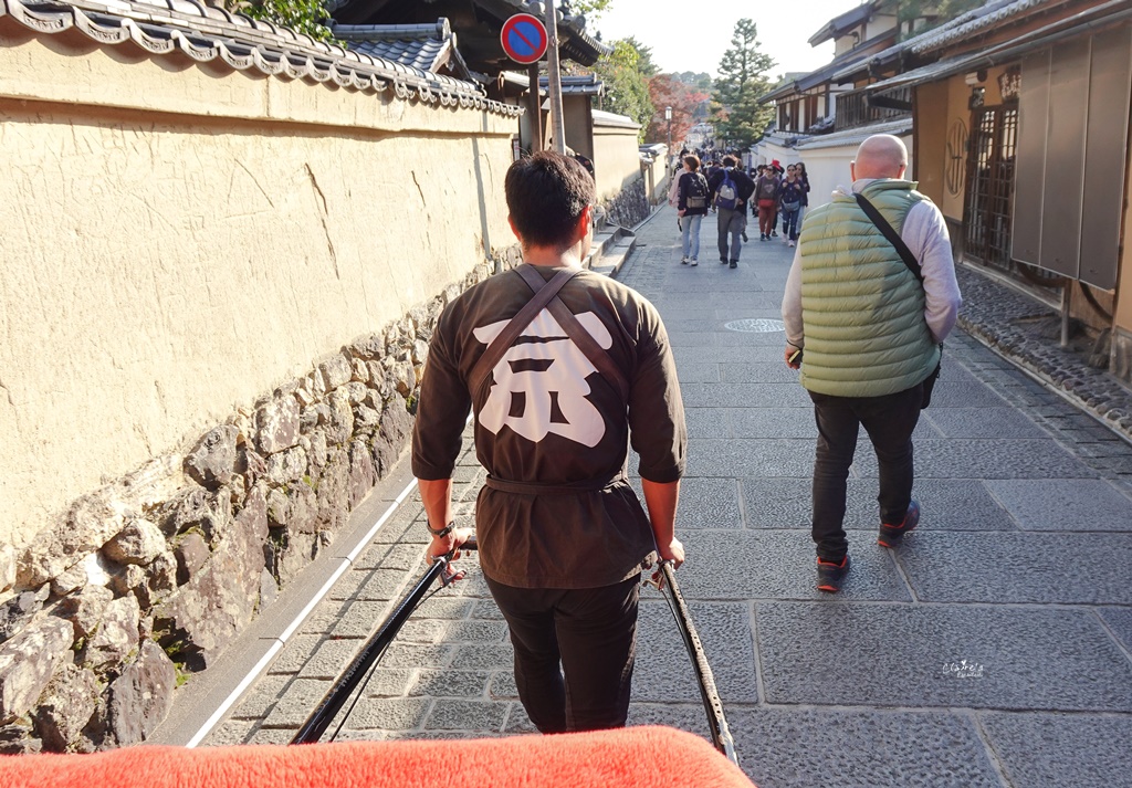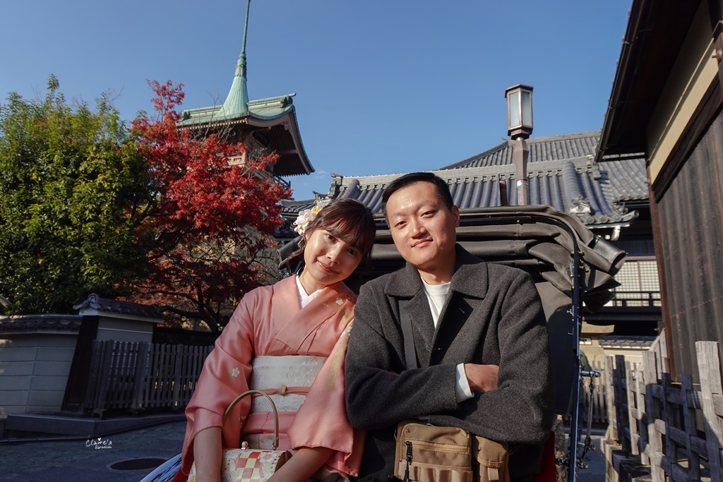 於是我們便上前詢問是否有到清水寺的路線,親切的人力車司機表示有,計費方式是按照時間計算,從八坂神社到清水寺約半小時,費用10,000日圓,有點貴但還算可以接受,我們就開心的上車了。