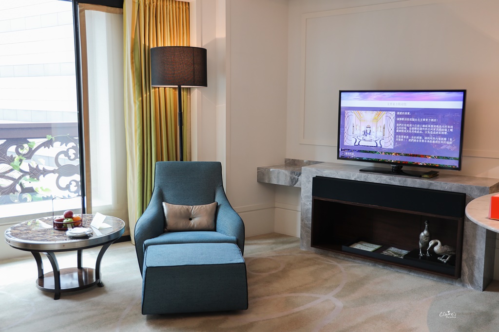 文華客房有著整面的落地窗,採光很棒。窗邊的小桌子擺放了迎賓水果,可以悠哉的在躺椅上邊吃水果邊看書。我很喜歡這張孔雀藍的躺椅,躺在上面,一不小心睡意就會襲捲而來。