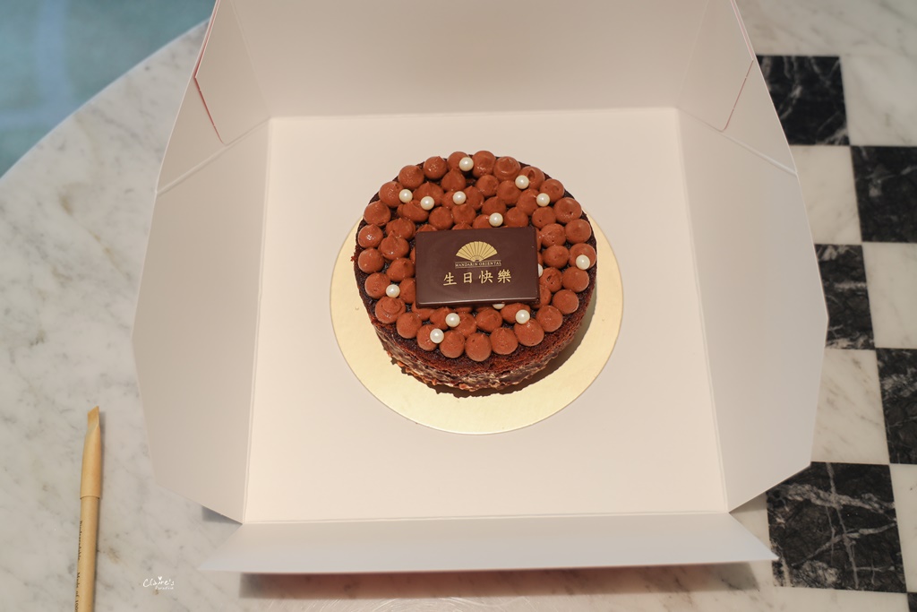 我從一進門就興奮的到處拍照,過了一陣子才發現桌上擺了一個盒子跟卡片,原來是文華東方替我們準備的生日/週年祝賀卡與蛋糕,收到祝福總是覺得很開心,於是我又進入了傻笑的狀態…笑的臉好痠。(查詢即時房價:Agoda/Booking.com)