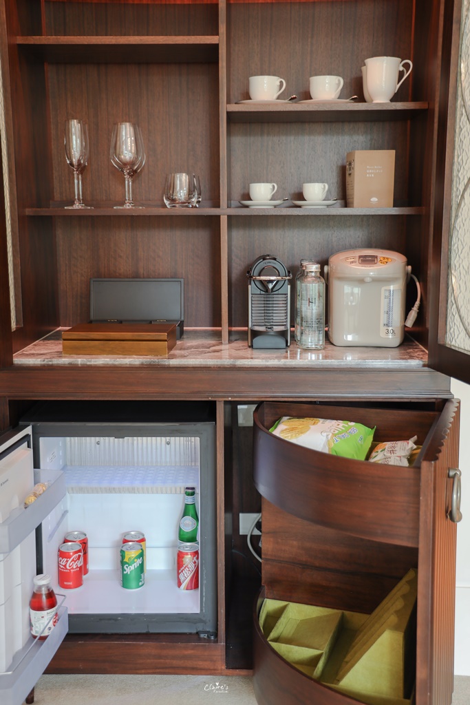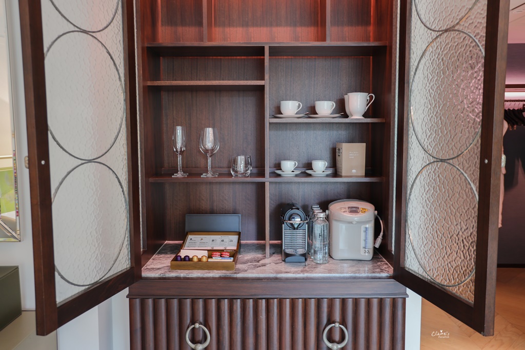 櫃子打開是Mini bar,裡面有著各種大小、不同功用的杯子,不論是喝水、喝茶、喝咖啡、喝酒都有各自的杯子可以使用。