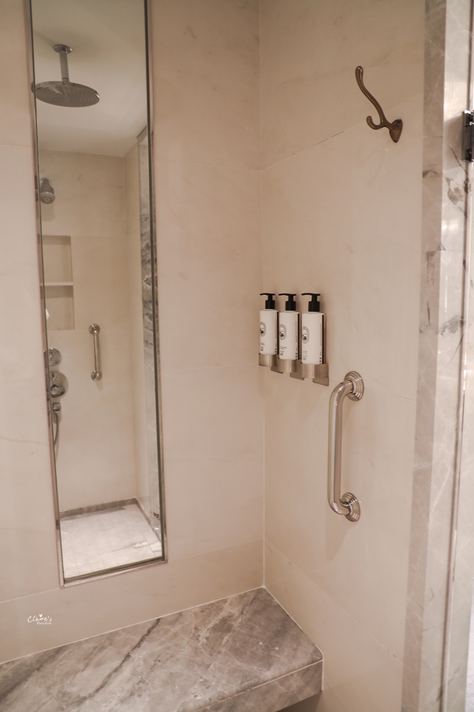 淋浴間的部分也不馬虎,各種細節都有兼顧,而且一樣很大間,大約是我家淋浴間的五、六倍大。來到台北文華東方酒店,有一種劉姥姥逛大觀園的既視感,一切都是如此不可思議,也或者是貧窮限制了我的想像。
