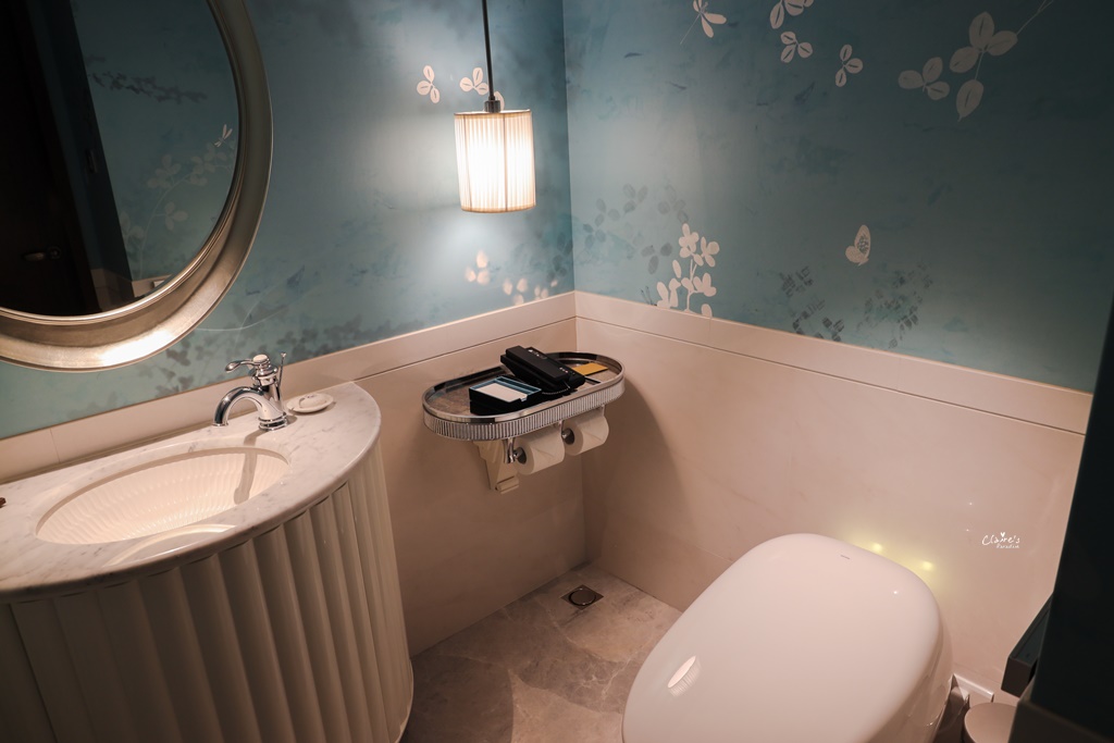 這裡的洗手間與浴室是獨立的,位於入口旁的洗手間,寬敞的空間就不用多提,裡面不論是洗手台、燈飾、鏡子,都設計的很典雅,我尤其喜歡牆上的壁紙,具有畫龍點睛的效果,每次一進來都很想在裡面多待幾分鐘。
