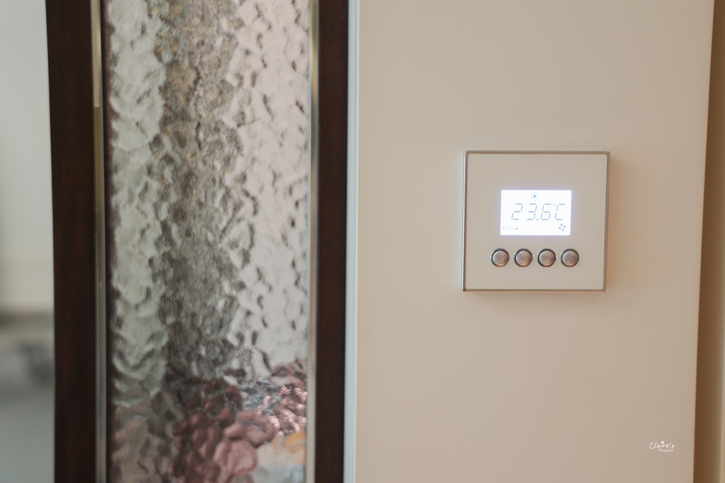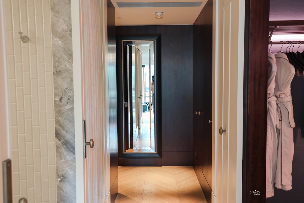 從入口進來之後,玄關處有一個全身鏡,接著會經過一小段走廊才會到房間。走廊兩側的配置是這樣的,洗手間與更衣室在同一側,更衣室對面則是浴室。這個區域的地上沒有鋪地毯,而是使用國外咖啡廳或居家空間常見的人字拼木地板,偶爾真的有一種置身在歐洲的錯覺。
