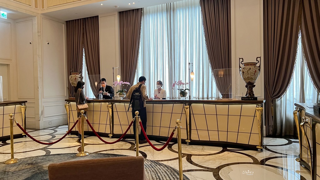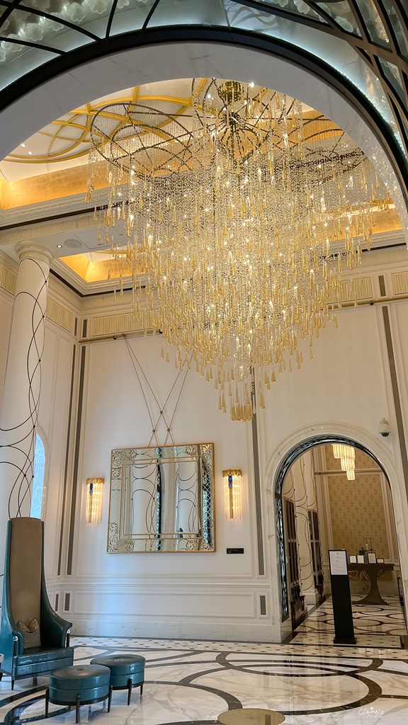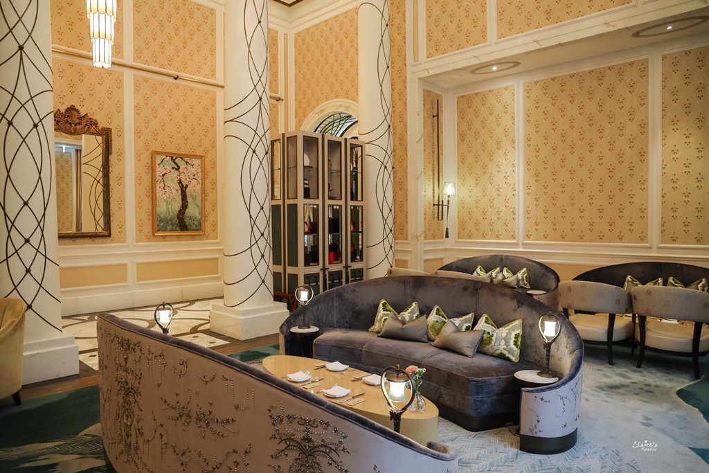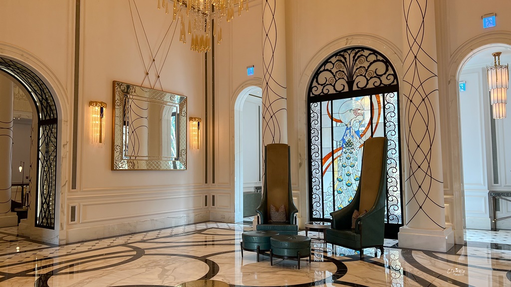 接待櫃檯旁邊即是酒店大廳,每年的聖誕節,大廳都會有浮誇的聖誕樹布置,吸引眾多網美們前來拍照。平常即使沒有聖誕樹,這個場景本身也已經夠華麗了,看看上方那盞接近四公尺、閃爍著金黃色光芒的水晶吊燈,以及氣勢十足的貴妃椅與背後的孔雀彩繪玻璃,都讓人捨不得把目光移開。