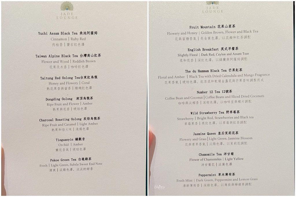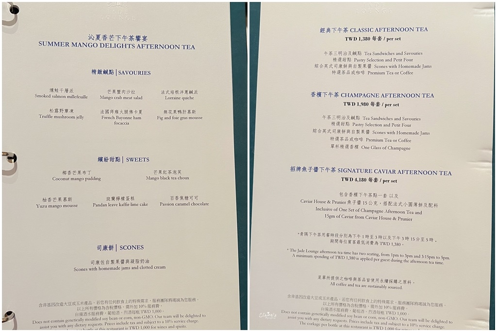 菜單如下,包含一套經典下午茶與兩壺茶。我們入住的時後剛好是芒果的季節,因此下午茶皆以芒果入菜。