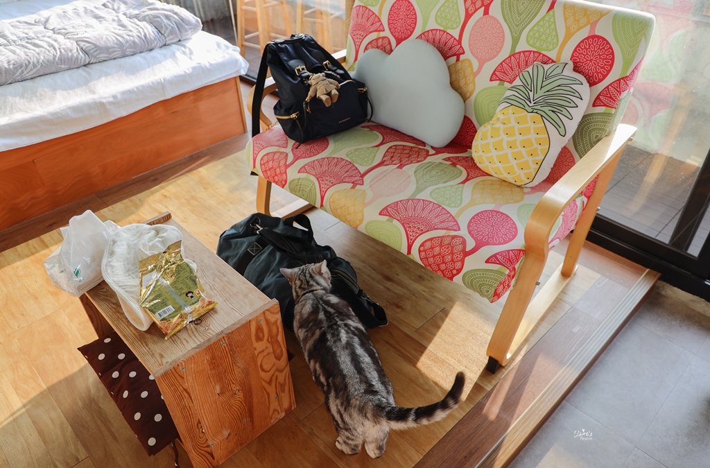 宜臻帶著我們到房間,簡單的介紹環境之後就離開了,跟隨她的腳步而來的貓咪卻還賴著不走,於是,我就把房門關起來不讓牠離開了哈哈哈(直接在別人家裡綁架他們的貓咪)。
