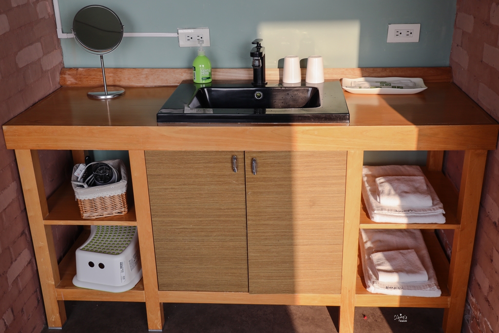 浴室牆上的黃色小鴨很吸睛,雖然裡面設有浴缸,不過當時正好遇到限水,所以我們就沒有使用了。由於這裡很貼近大自然,因此房間內難免會有昆蟲出沒,我自己是沒有遇到什麼可怕的蟲,但是在浴室牆上倒是有看到一些大螞蟻(床鋪跟沙發都沒有,別擔心~),不過也沒有影響到我們,就…直接忽視它。