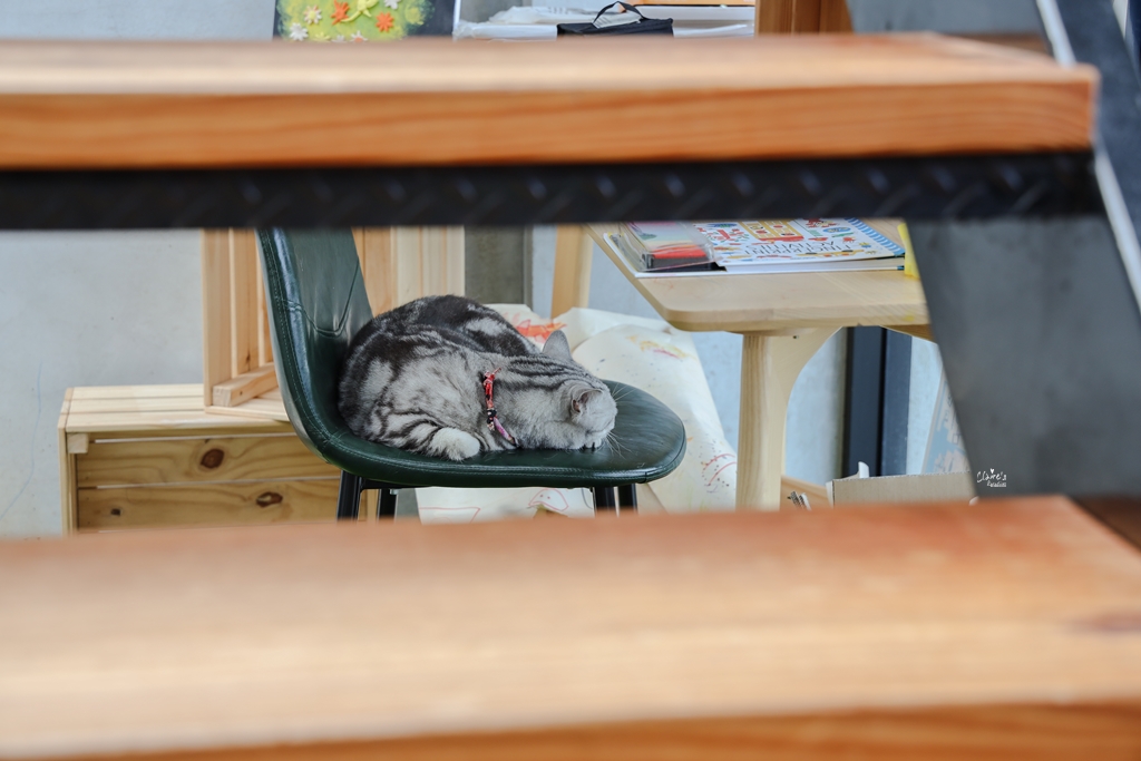 有時候找不到貓咪的話,可以找找看一些隱密的角落,我在樓梯拍照的時候,不經意的瞄了一下樓梯旁的椅子,才發現貓咪窩在上面睡得正舒服呢!(後來上樓的旅客們也發現了,然後又是一陣「好可愛~~~」的驚呼聲)